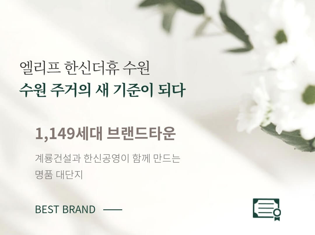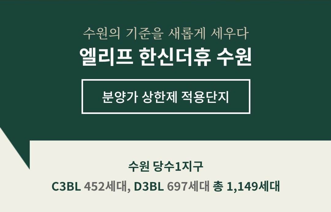 계룡건설과 한신공영이 시공한 ‘엘리프한신더휴 수원’이 10월 중 분양에 들어갑니다. 수원당수 D3BL 엘리프한신더휴는 당수동 일원에 들어서는 택지 개발 지구인 당수지구의 메인 입지로 자리 잡을 예정입니다.