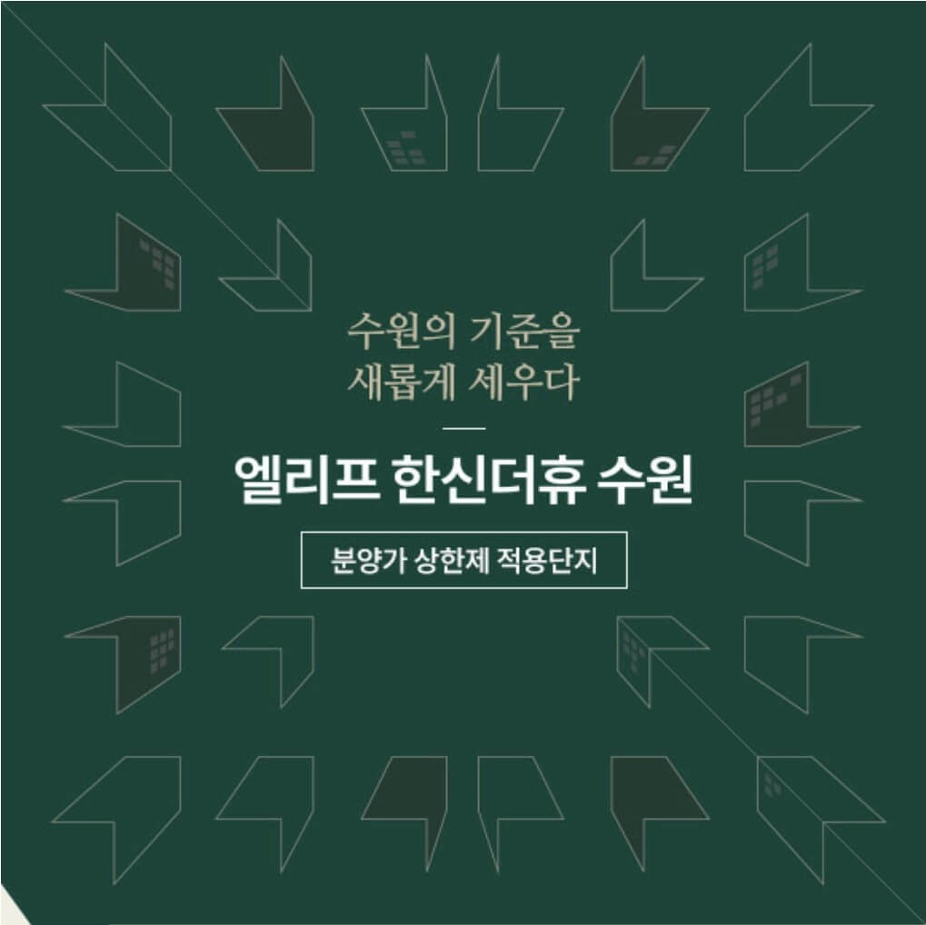 분양가상한제가 적용돼 비교적 저렴하게 공급될 것으로 보입니다. 엘리프한신더휴 수원의 예상 분양가는 전용면적 84㎡ 기준 7억 원 초반으로 전망됩니다.